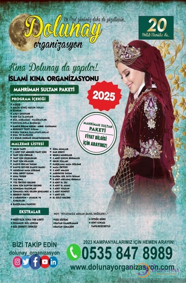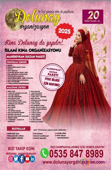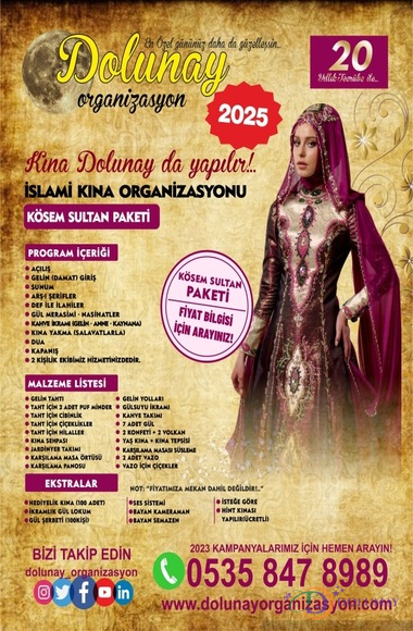Sizler de Dolunay Organizasyon firmamızdan İslami kına organizasyonu hizmeti alabilir, aldığınız hizmet ile hayallerinizdeki kına gecesine kavuşabilirsiniz. Konu hakkında daha detaylı bilgi almak ve hizmet talebi oluşturmak isterseniz, bizlere telefon numaralarımızdan ulaşabilirsiniz.
